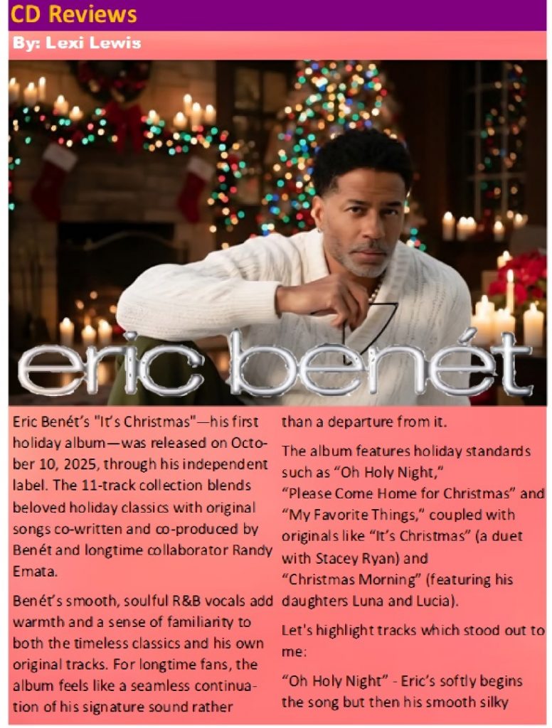 Eric Benét’s “It’s Christmas”—his first holiday album—was released on October 10, 2025, through his independent label. The 11-track collection blends beloved holiday classics with original songs co-written and co-produced by Benét and longtime collaborator Randy Emata.