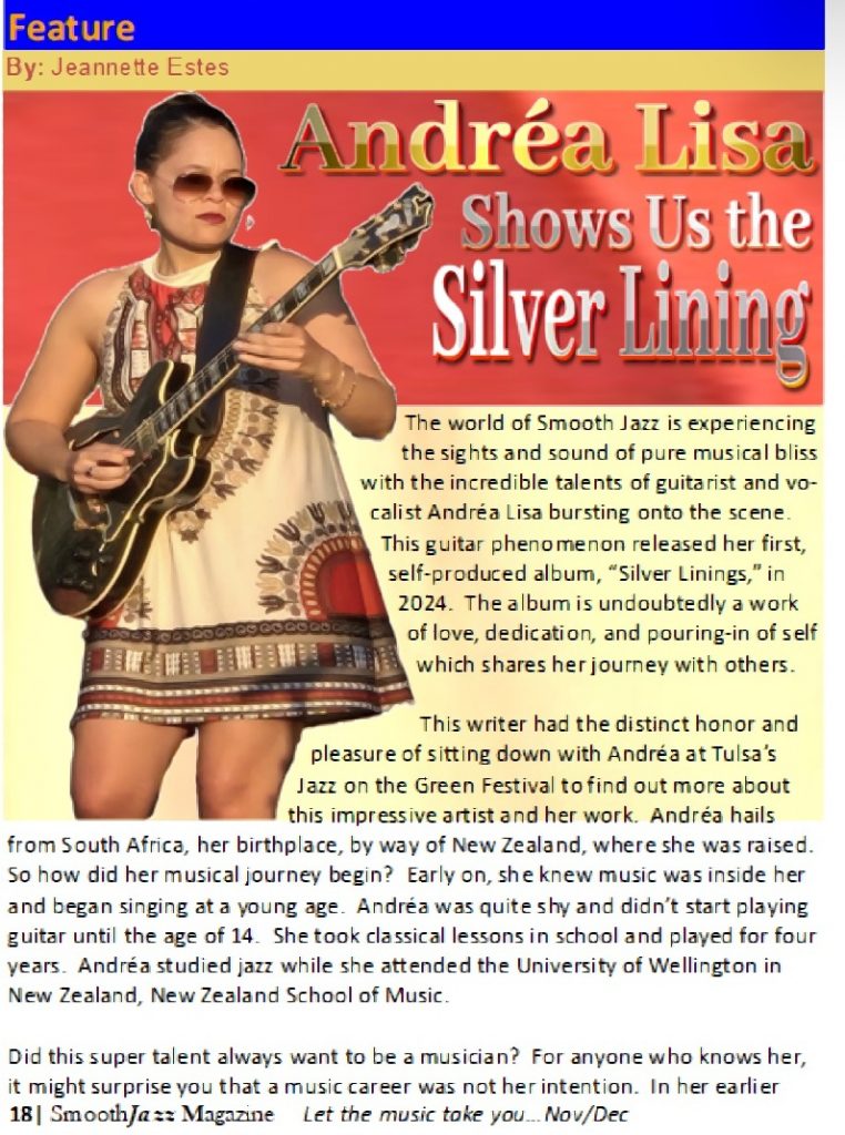 The world of Smooth Jazz is experiencing the sights and sound of pure musical bliss with the incredible talents of guitarist and vocalist Andréa Lisa bursting onto the scene. This guitar phenomenon released her first, self-produced album, “Silver Linings,” in 2024. The album is undoubtedly a work of love, dedication, and pouring-in of self which shares her journey with others.